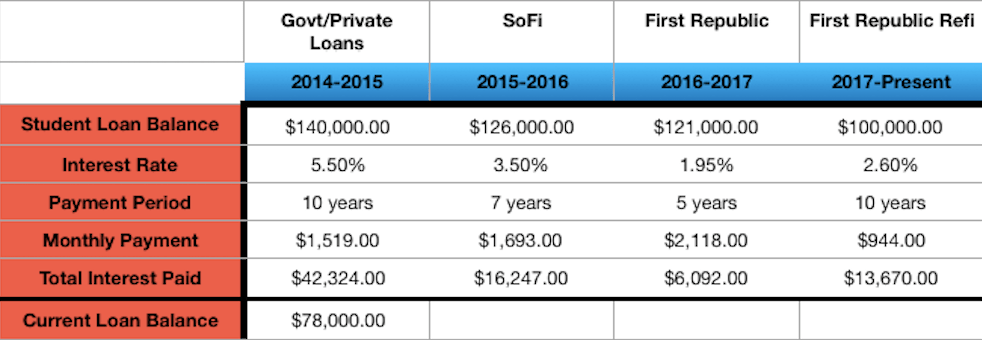 Here’s a screenshot of my student loan balance over the years. The balance you’re seeing is from my undergraduate and graduate training combined. Oh, how I wish I had parents who could have helped me pay for school. I’m envious of the classmates and SRNAs who go through their nurse anesthesia program debt-free. I refinanced my student loans a few times. The first time was with SoFi because I could not fathom paying back my government and private loans at such a high rate. 3.5% through SoFi was pretty good. That was until I came across First Republic which was and is offering THE lowest rates you’ll ever find for student loans. Initially, I refinanced to 1.95% over 5 years because I was hell bent on paying my loans down. That was until I came across an incredible opportunity to purchase a rental property that has allowed me to increase my earnings in ways I can’t do on a CRNA income alone. As a result, I ended up having to refinance my First Republic loans to 2.60% over 10 years.